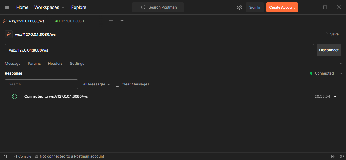 If we omit the conn variable and run the code, we will be able to connect to our /ws endpoint by using any API Client software such as Postman.